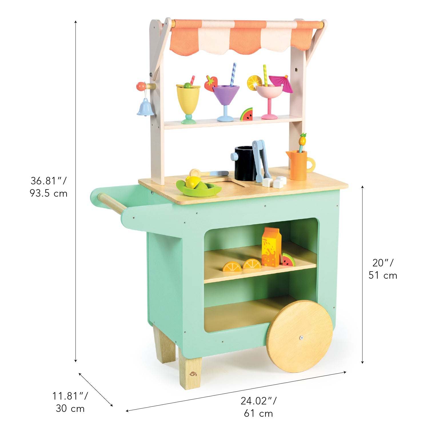 A bright colourful drink trolley stand on wheels, with a striped fabric awning and accessories to throw a mocktail party! Serve up a lemonade, fruit crush or fizzy delight in one of 3 different shaped and coloured wooden ‘glasses’. Add an umbrella, piece of cut fruit, or stirrer and a striped straw, an ice cube or 2, and sip away! There is a compartment with a sliding lid, and a shelf underneath to add more fun foodie products. A blackboard circle on the front and the other side to write welcome messages and menus with chalk.