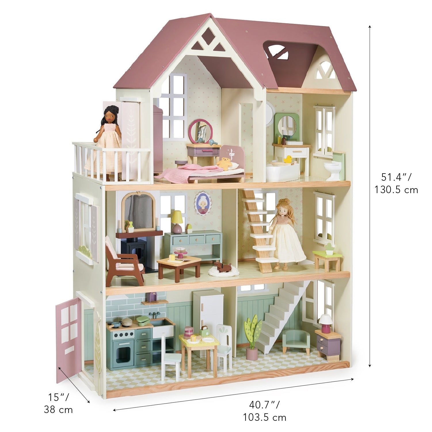 A large open-fronted wooden dolls house scaled for 9.84” / 25cm dolls. Beautiful contemporary soft colours and detailed illustrations make this house unique and premium. The gabled roof and attic space, opening shutters and front door with windows at the back panel allow light to flood into the spacious interior. Access to a balcony on the second floor gives extra interest and space to play. Furniture included.