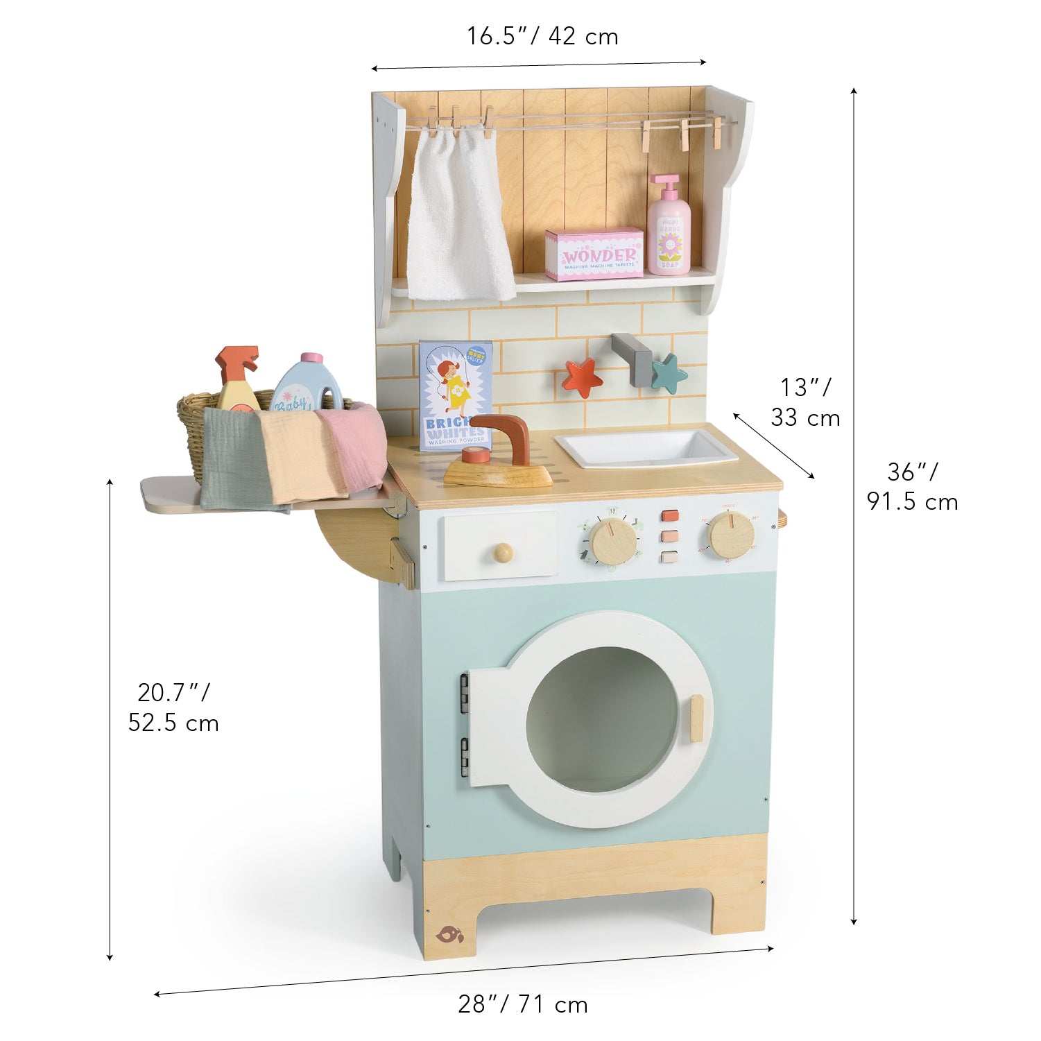 An all encompassing laundry unit where you can wash, dry, iron and fold away all your dolly laundry! Use the pretty wicker basket to collect the dirty laundry, pop it all in the washing machine and add 2 tablets into the top drawer. Press buttons to start/stop, and select a cycle and spin speed on 2 clacking knobs. Select temperature for the drying cycle and watch as the clothes get tumbled about! A sink area to hand wash and a variety of 3 wooden and 2 cardboard cleaning products to assist a bright wash day! Hang the clothes on one of 3 lines with wooden pegs, and finally give it all a good press on the fold up ironing board on the side. Good for pretend play. Good for social and language skills.